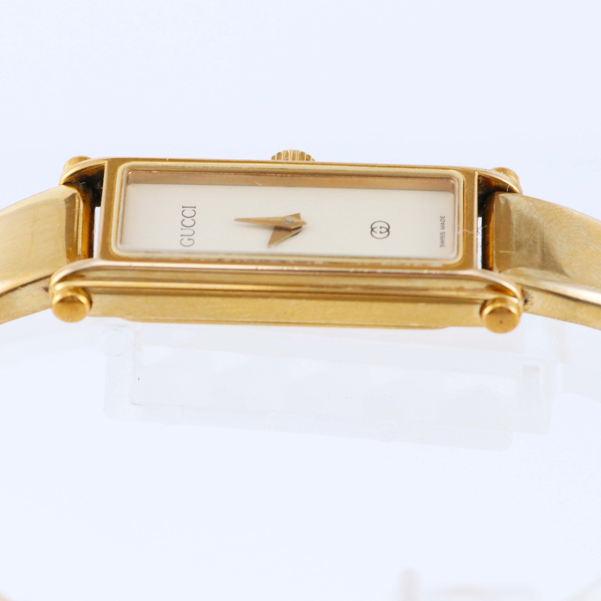 A beautiful vintage Gucci 1500L from the 1990s, designed like a slim gold bracelet with a minimalist rectangular dial.